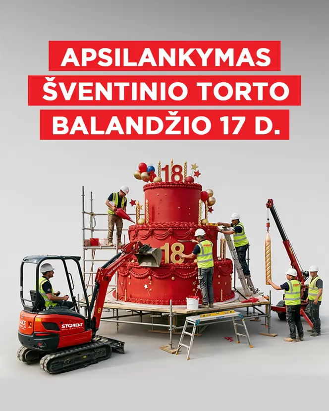 STORENT šiemet švenčia 18-ąjį gimtadienį! Todėl balandžio 17 d. kviečiame pasivaišinti šventiniu tortu visuose STORENT nuomos centruose – vyk į artimiausią vietą ir švęskime kartu!